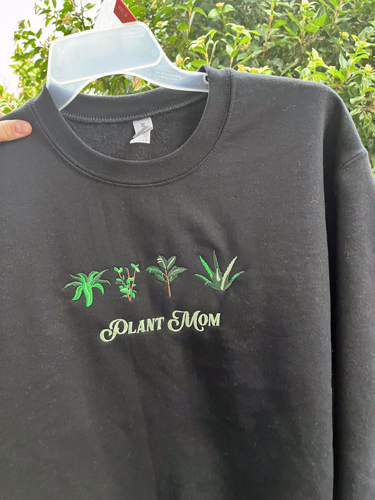 Plant Mom embroidered Crewneck Sweatshirt | Black Embroidery Plant Sweatshirt |