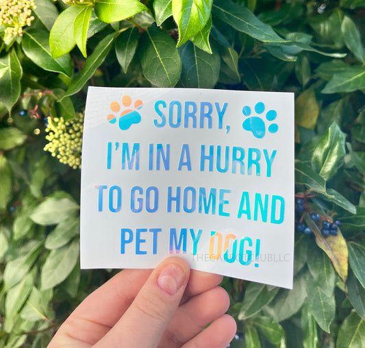 Sorry I'm In A Hurry To Go Home And Pet My Dog Holographic Vinyl Decal 4, 5, 6 inch | Car Bumper Sticker | Window Decal for Dog Mom