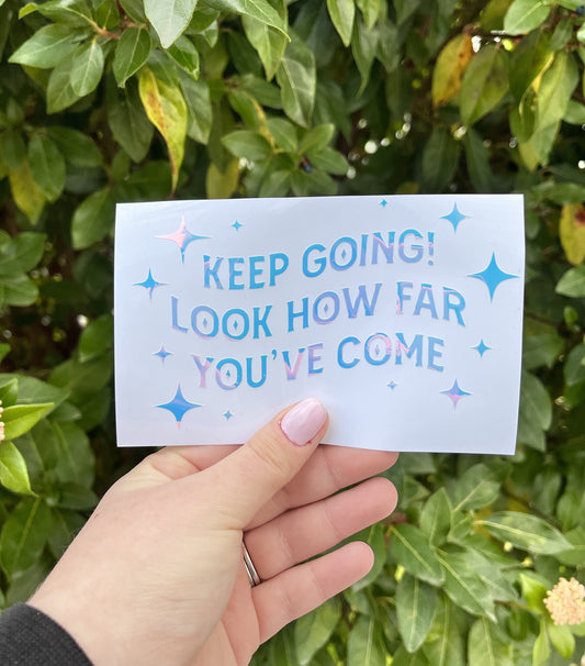 Keep Going, Look How Far You've Come Vinyl Car Decal | 3, 4, 5 inch Wide Holographic Bumper Sticker | Personalized Bumper Sticker Car Decal