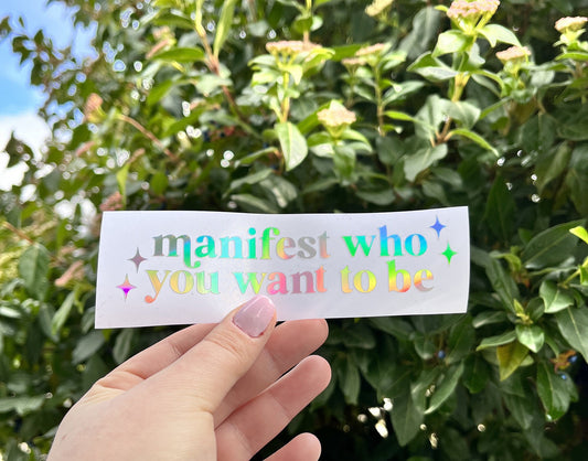 Manifest Who You Want to Be Vinyl Car Decal | 3.5, 4.5, 5.5 inch Holographic Bumper Sticker | Personalized Cute Car Decal Vinyl Sticker